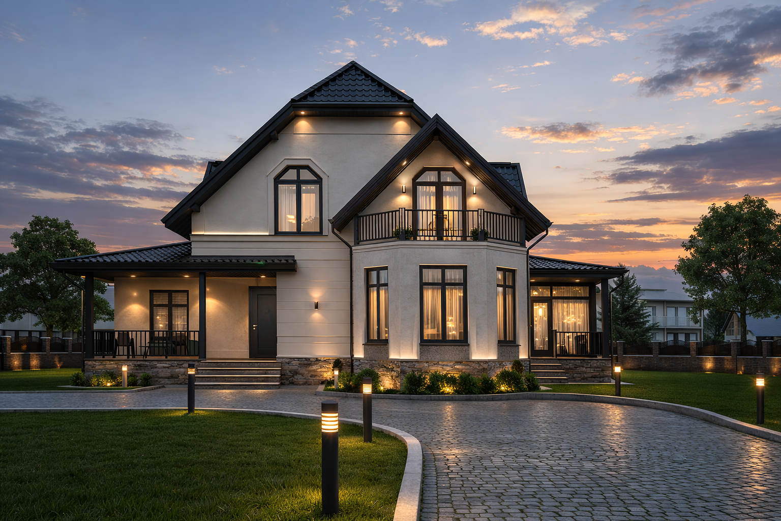 Окна с установкой;Покрытие кровли металлочерепицей;Отделка фасада виниловым сайдингом;Подшив карнизов крыши софитами;Водосточная система;Входные двери.